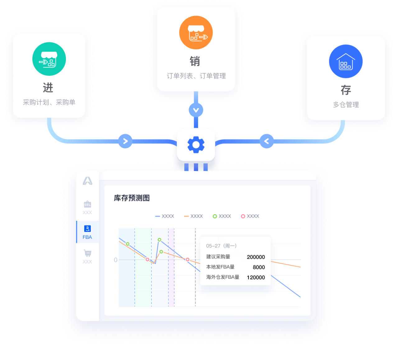 打通采购、仓储、发货、物流、平台仓库、第三方仓库、实现智能补货建议,智能库存预警